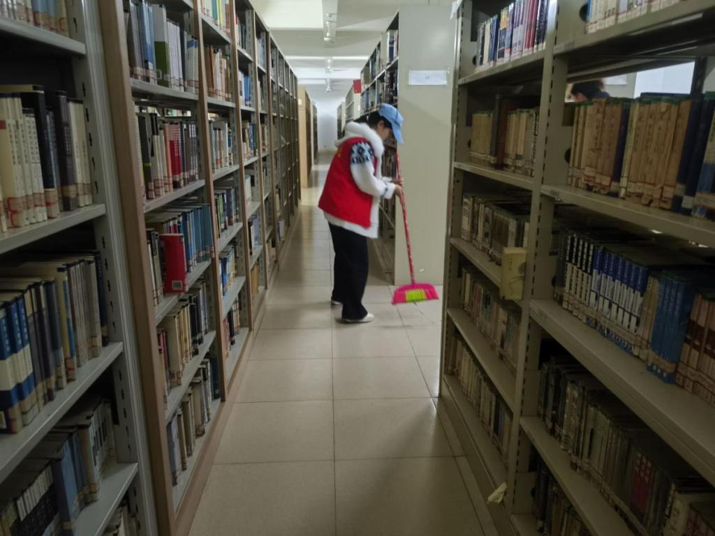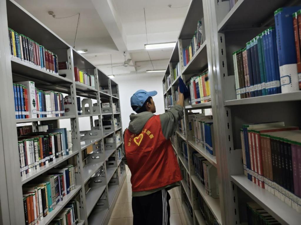 志愿者们在九江学院主校区图书馆迅速分工、默契合作。他们手持工具细致清扫地面与书架角落,按分类规范将错位书籍逐本归位。大家以饱满热情投入服务,用行动践行志愿精神,营造出干净有序的阅读环境,为校园传递了温暖的奉献正能量。
