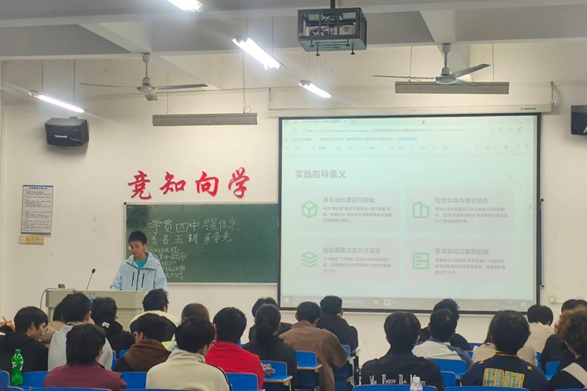 齐唱团歌过后,团日活动准时开始。各班团支书和组织委员组织各班开展“学贯四中强信念 青春五新勇争先”团日活动,主讲人围绕“青年在日常生活中如何用实际行动践行党的二十届四中全会精神”作专题分享,结合具体案例阐释“党的二十届四中全会精神在实际生活中的具体体现”,引导团员们更好地理解和认识党的新时代化理论的内涵,深刻体悟党中央治国理政的高超智慧和强大能力。