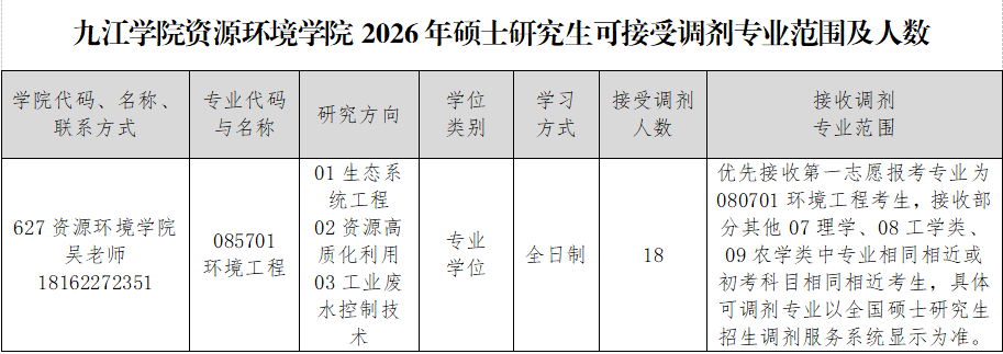 (一)凡有意向调剂的考生请先仔细阅读我校《九江学院2026年硕士研究生招生简章》,并在“全国硕士生招生调剂服务系统”(公网网址:https://yz.chsi.com.cn,教育网网址:http://yz.chsi.cn)开通后,登陆查看相关专业缺额情况、填报调剂志愿。